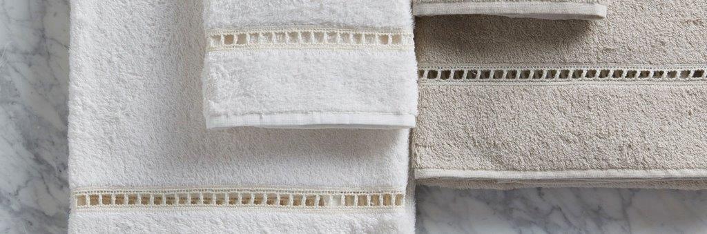 Regala o regalati morbidissimi asciugamani in spugna di puro cotone. In tinta unita semplice, con ricami, pizzi o bordi applicati.