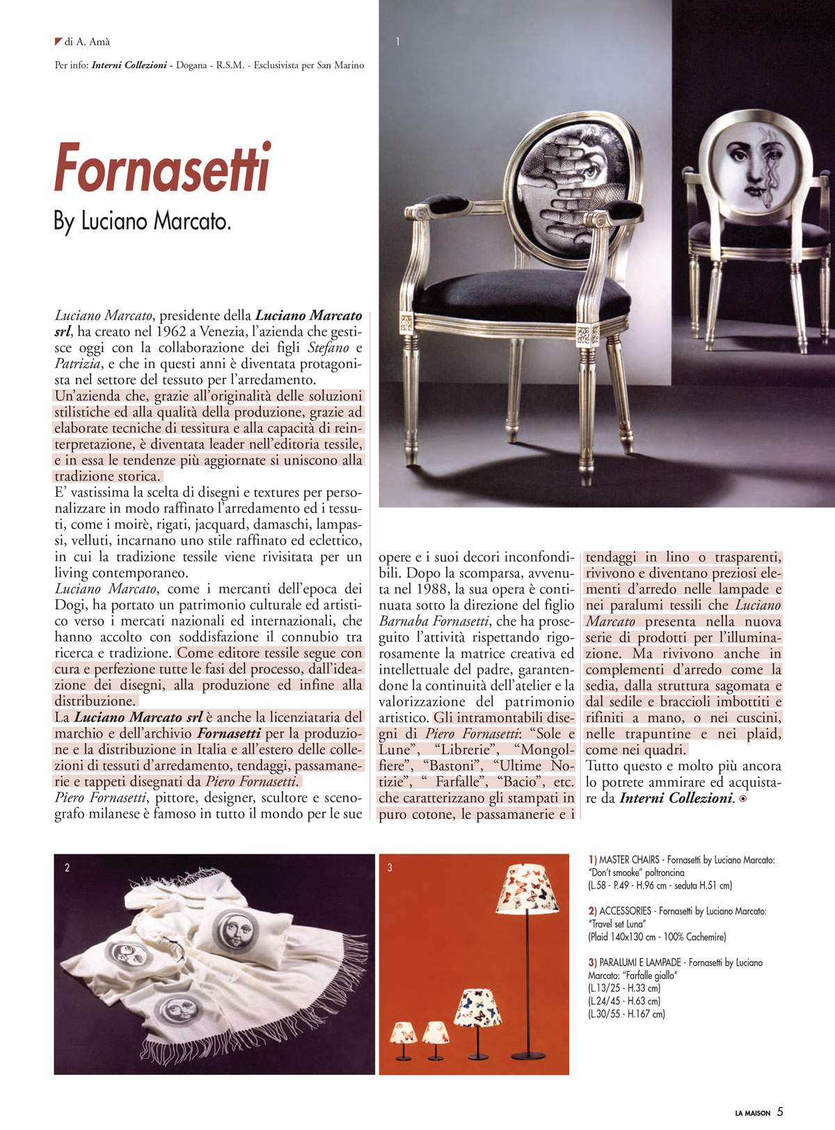 Gli intramontabili disegni di Piero Fornasetti: “Sole e Lune”, “Librerie”, “Mongolfiere”, “Bastoni”, “Ultime Notizie”, “ Farfalle”, “Bacio”, etc. che caratterizzano gli stampati in puro cotone, le passamanerie e i tendaggi in lino o trasparenti, rivivono e diventano preziosi elementi d’arredo nelle lampade e nei paralumi tessili che Luciano Marcato presenta nella nuova serie di prodotti per l’illuminazione. Ma rivivono anche in complementi d’arredo come la sedia, dalla struttura sagomata e dal sedile e braccioli imbottiti e rifiniti a mano, o nei cuscini, nelle trapuntine e nei plaid, come nei quadri. Tutto questo e molto più ancora lo potrete ammirare ed acquistare da Interni Collezioni.