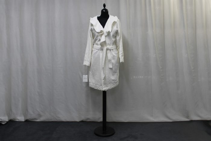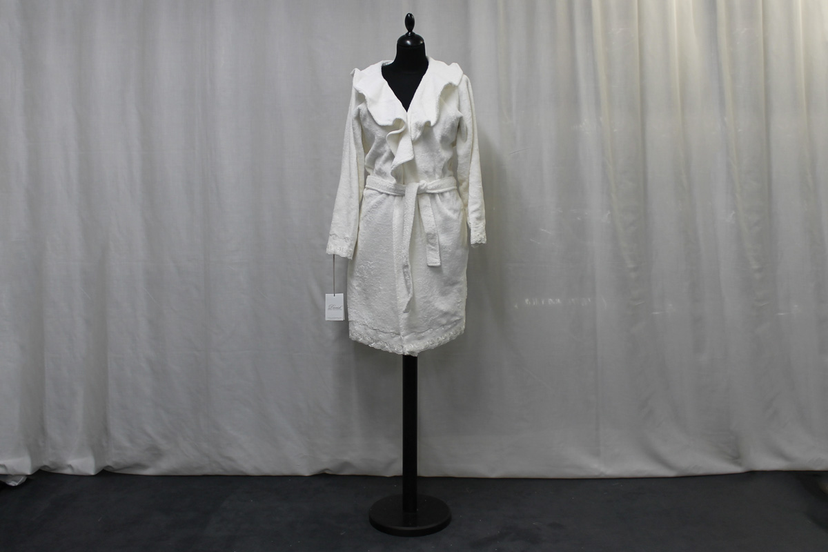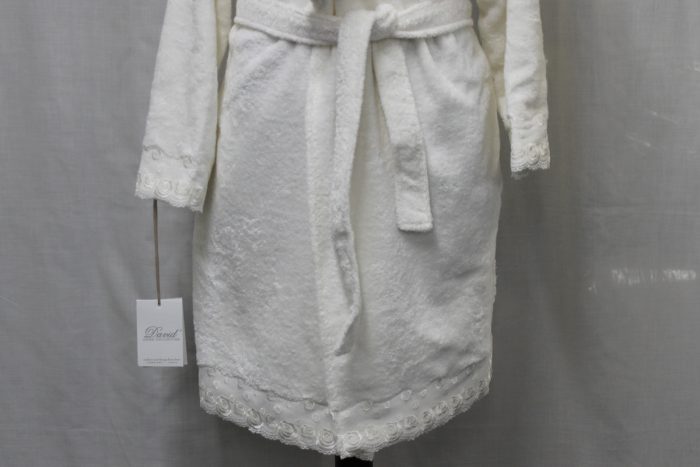 Un modello corto con applicazione di un fantastico pizzo con ricamo floreale su maniche e sul fondo dell’accappatoio.