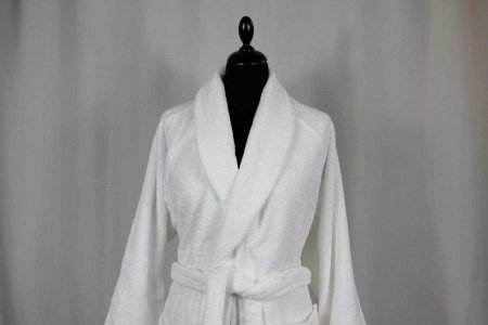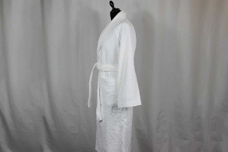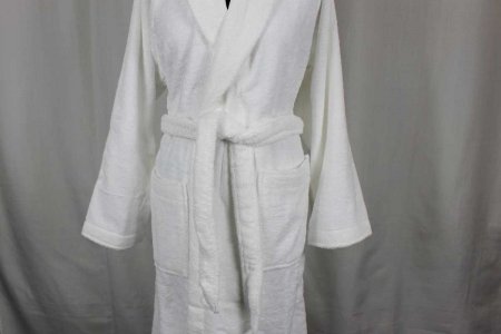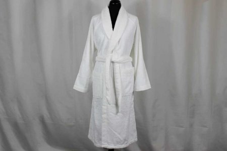 Accappatoio lungo con collo a scialle realizzato con spugna in puro cotone.