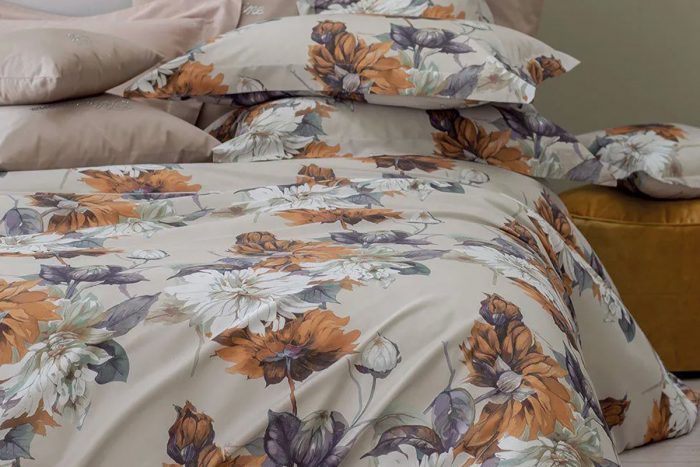 Il lenzuolo sotto con angoli è tinta unita in tono.