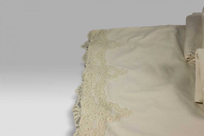 Il pizzo è ripetuto sul lenzuolo e sul lato delle federe a sacchetto.