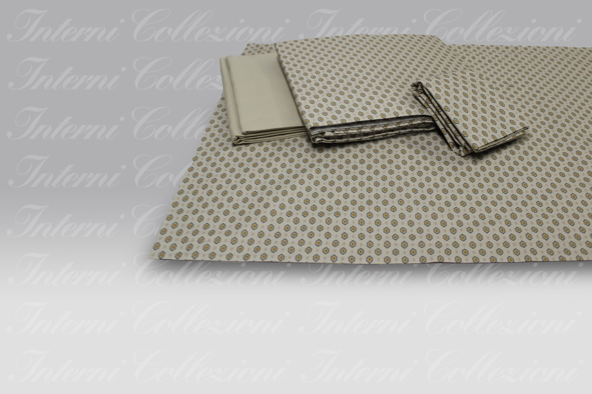 Le federe e il lenzuolo sopra hanno la fantasia a campo pieno, mentre il sotto con angoli è in tinta unita in tono.