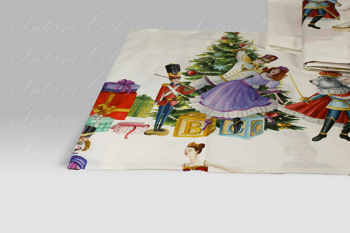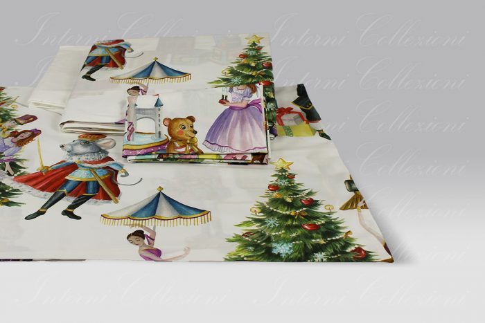 Una stampa Natalizia con schiaccianoci, ballerine e alberi di natale.