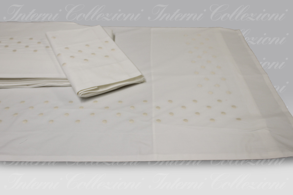 Sulle federe e sul lenzuolo sopra è presente un simpatico ricamo a pois.