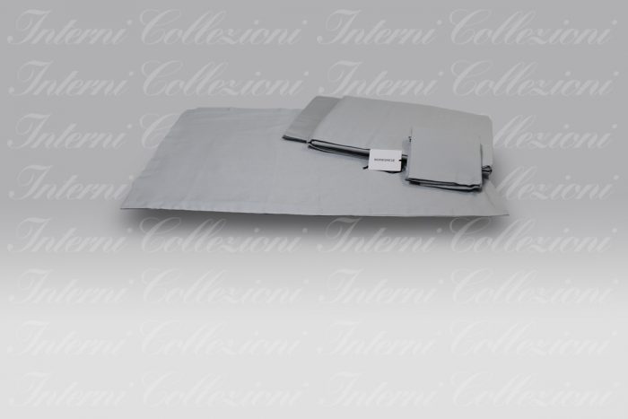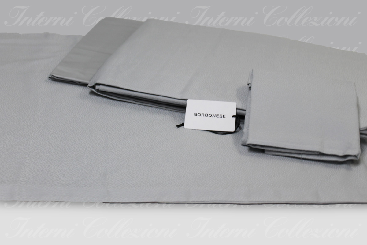Sul lenzuolo sopra e sulle federe troviamo un cotone jacquard con fantasia Borbonese, mentre il sotto con angoli è in tinta unita.