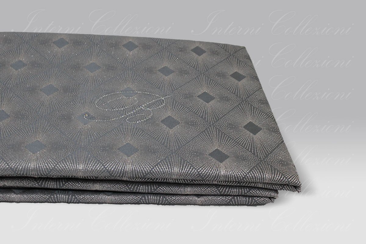 Un ricamo geometrico con filo lurex argento su una base color cenere.