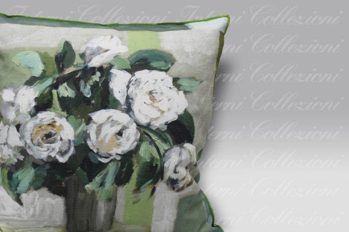 Cuscino adornato con vasi di fiori, contrapposti ad una disposizione grafica di piastrelle.