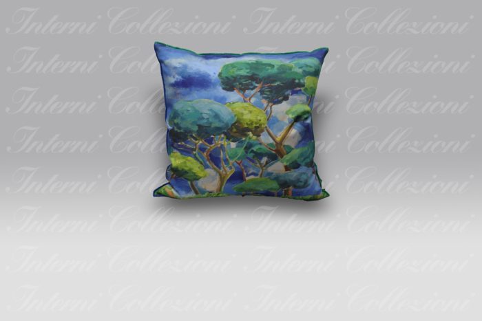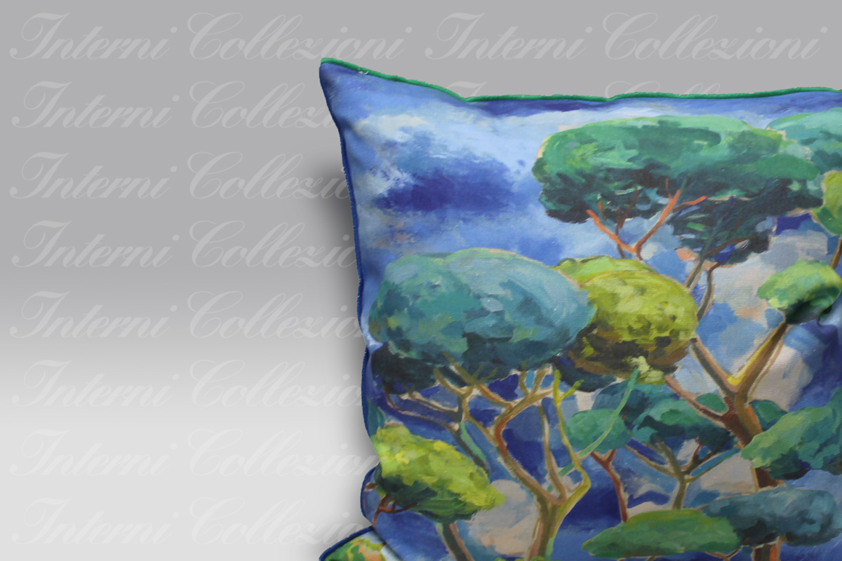 Questo cuscino decorativa è caratterizzato da raffigurazioni pittoriche e astratte di pini orientali.