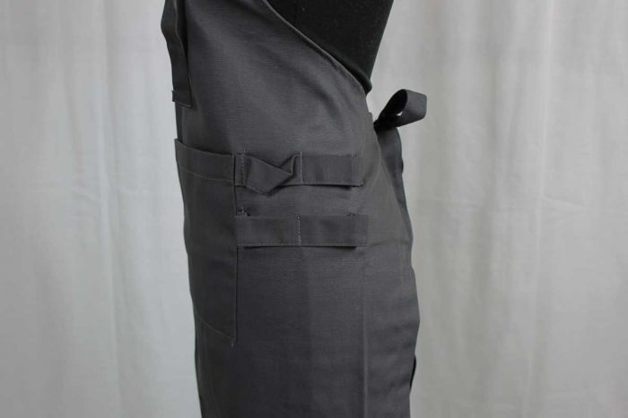 Super accessoriato: grande tasca sul grembo e porta canovacci.