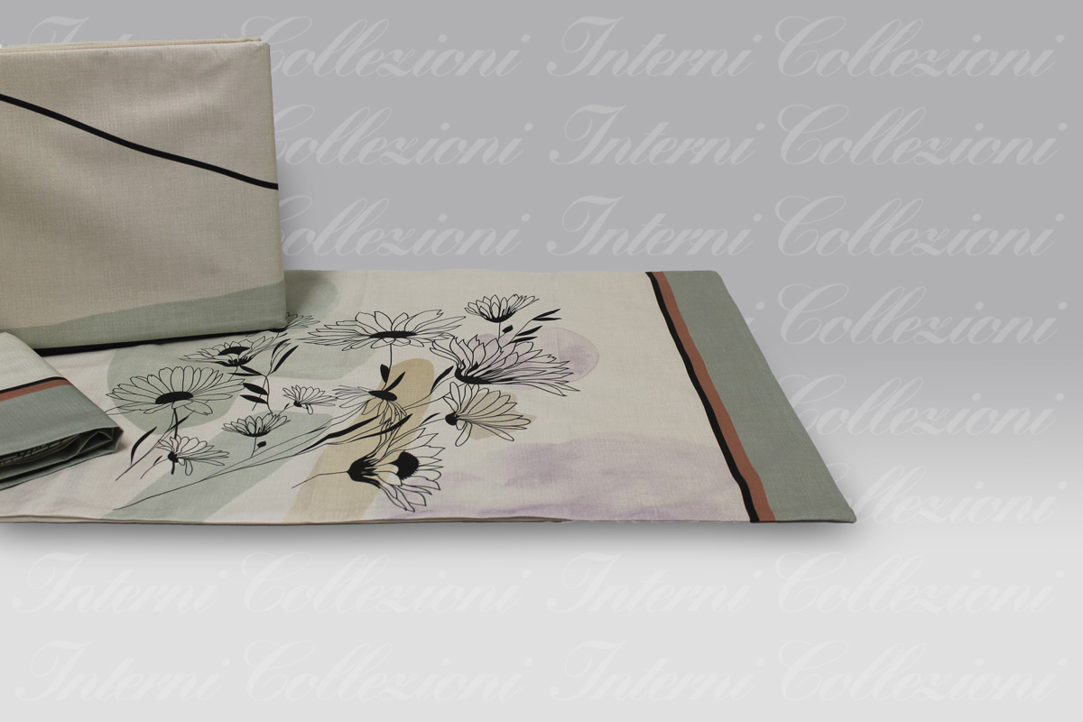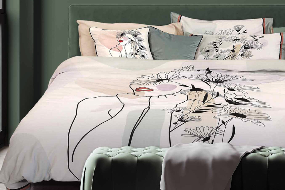 Una stampa piazzata con un volto femminile sul sacco, mentre le federe sono piazzate con stampa floreale stilizzata e bordi verdi.