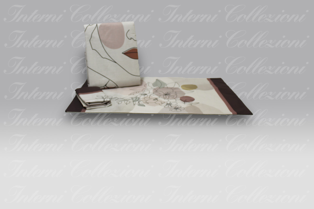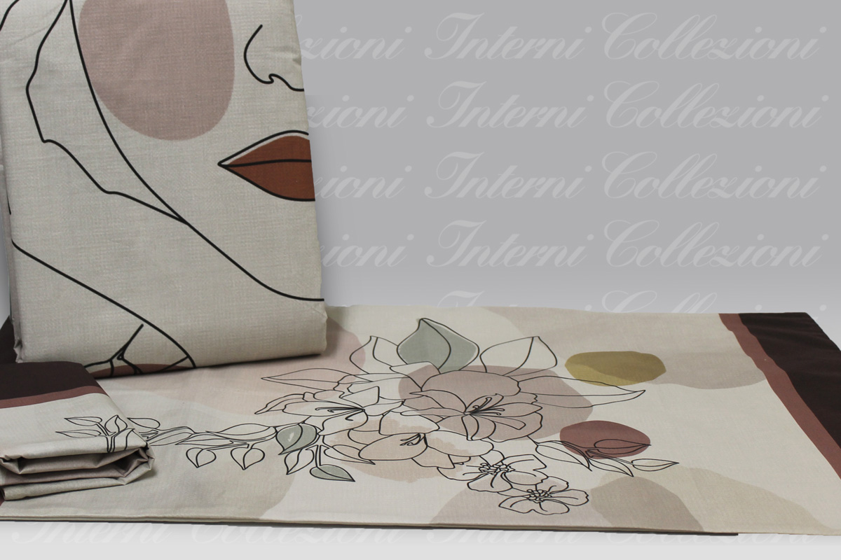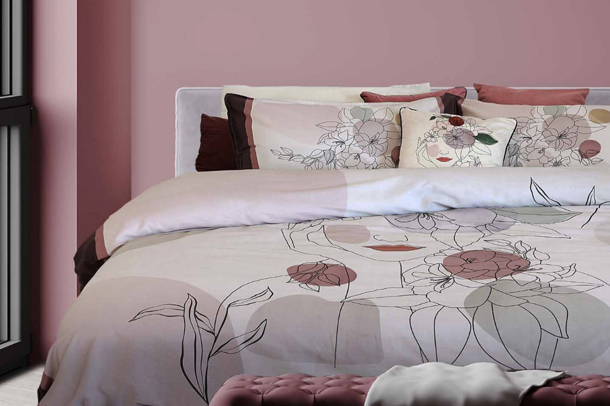 Una stampa piazzata con un volto femminile sul sacco, mentre le federe sono piazzate con stampa floreale stilizzata e bordi rosa-violetto.