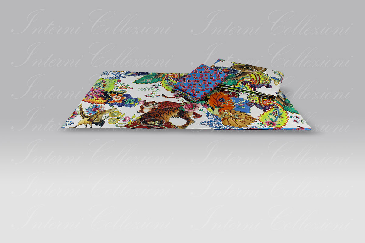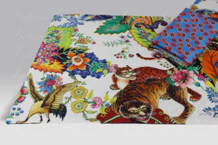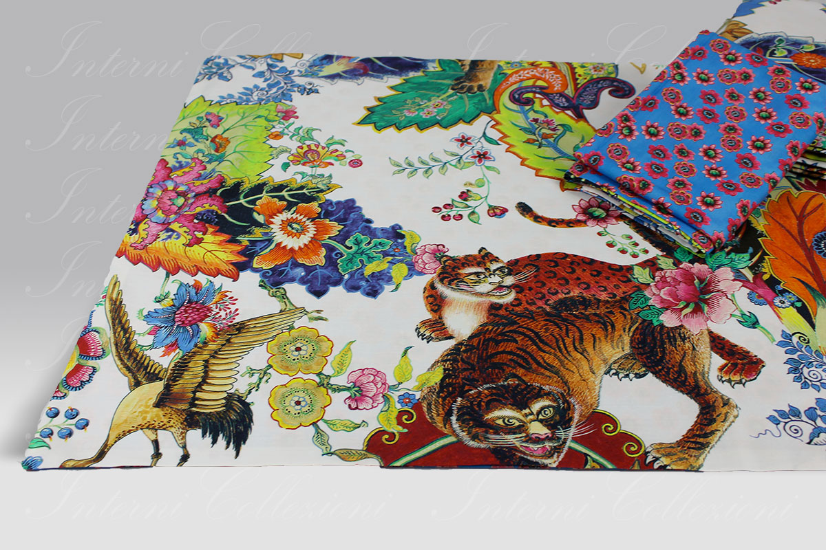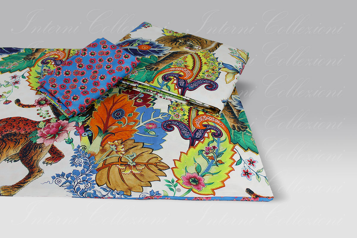 Stampa allegra e vivace variopinta in cui appaiono anche simpatiche tigri.