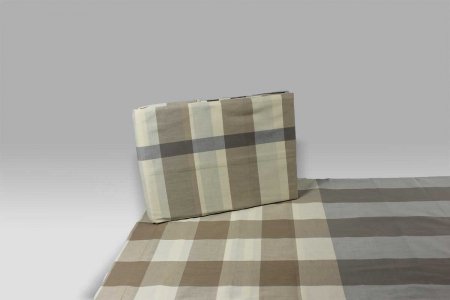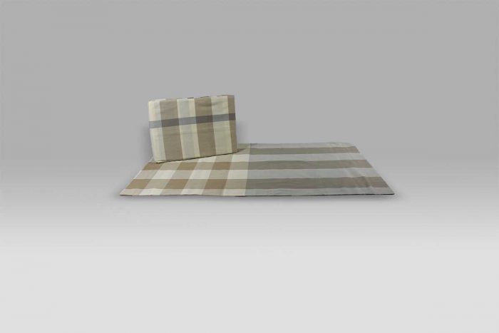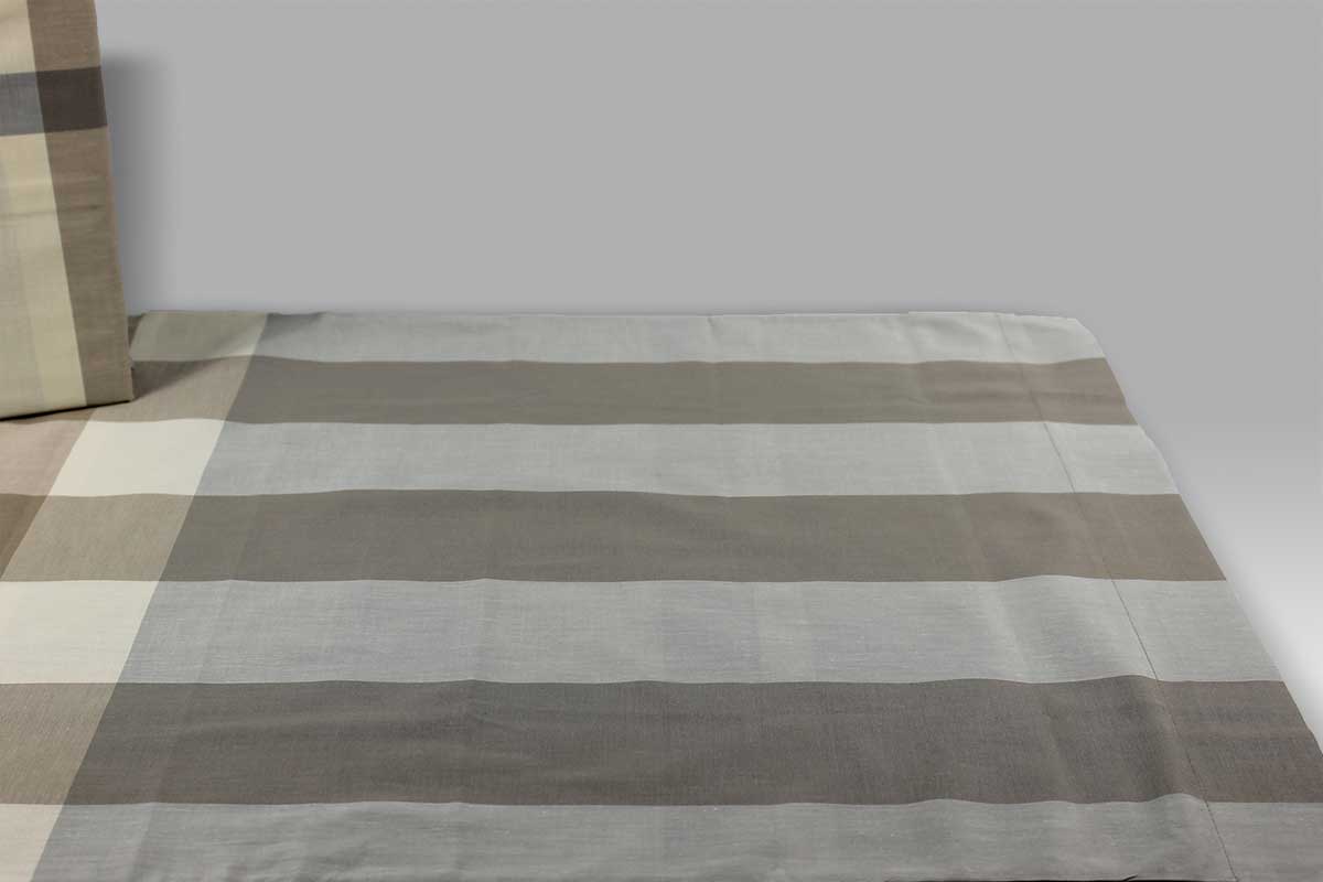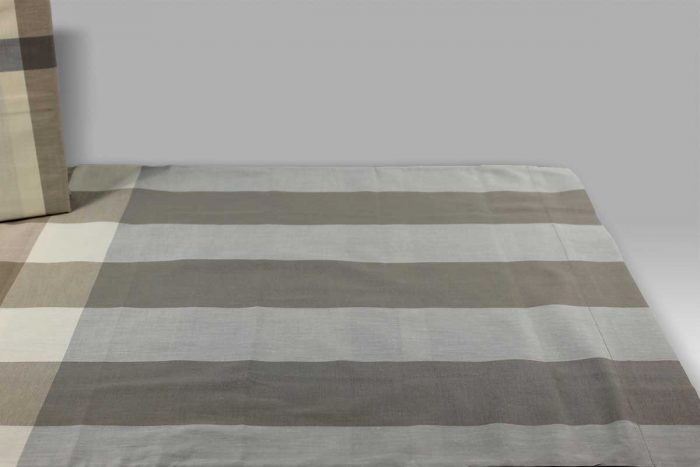 E’ realizzato in puro cotone tinto in filo e confezione federe a 2 volani.