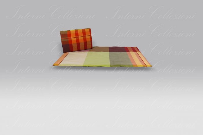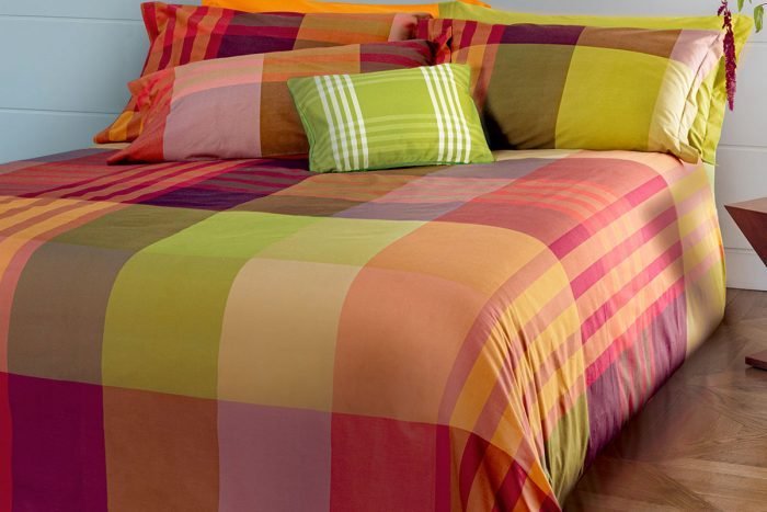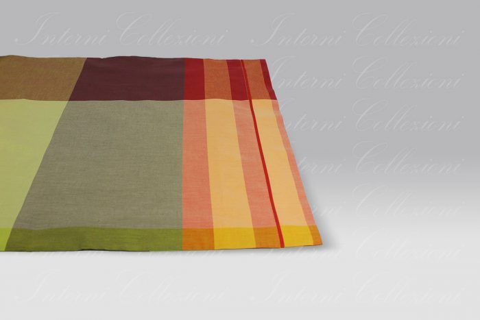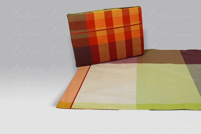 Viene realizzato in puro cotone tinto in filo. La confezione delle federe è a 2 volani.