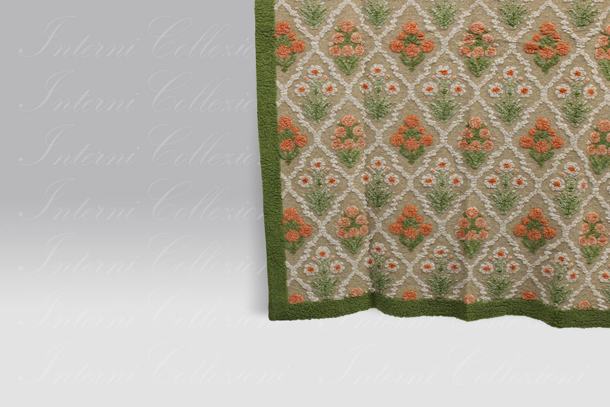 Unico il tessuto operato con disegno floreale nei toni dell’arancio e del verde.