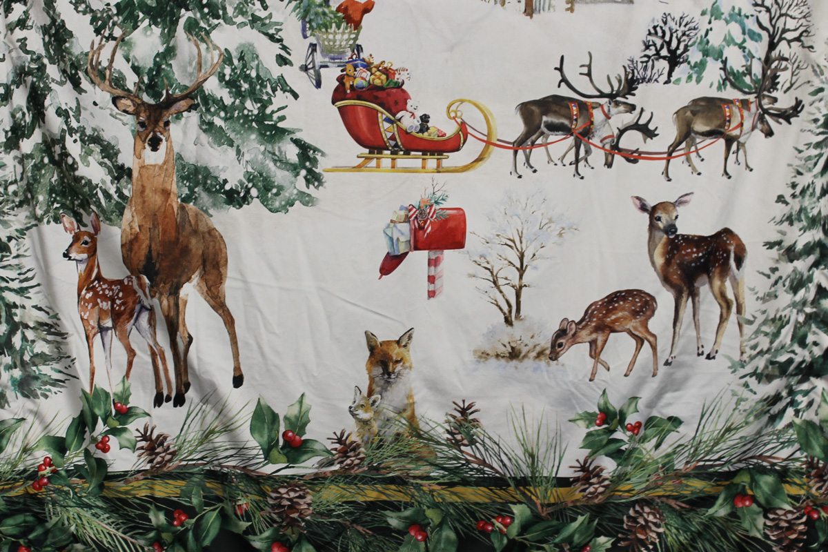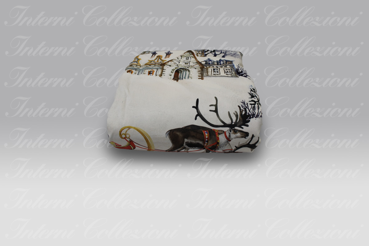 In questo articolo abbiamo una stampa con paese innevato, slitte e renne.