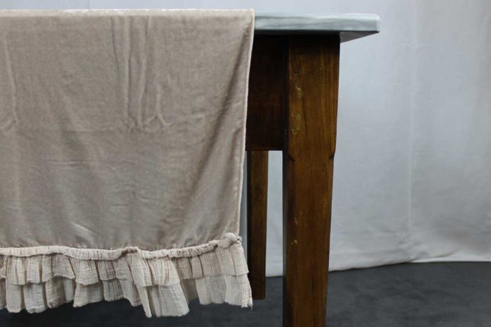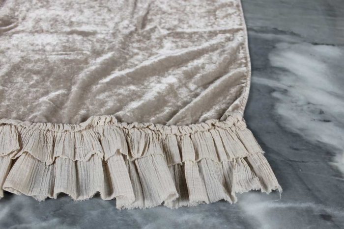 E’ realizzato con un velluto trattato (effetto vintage) su cui viene applicata una doppia rouche in tessuto.