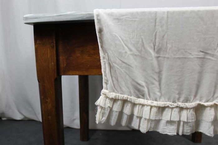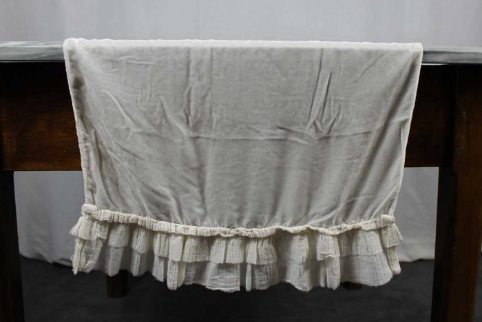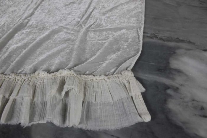 E’ realizzato con un velluto trattato (effetto vintage) su cui viene applicata una doppia rouche in tessuto.