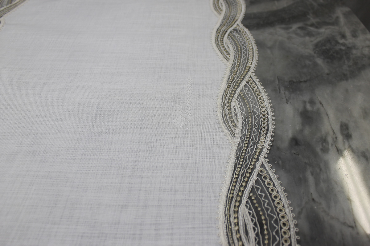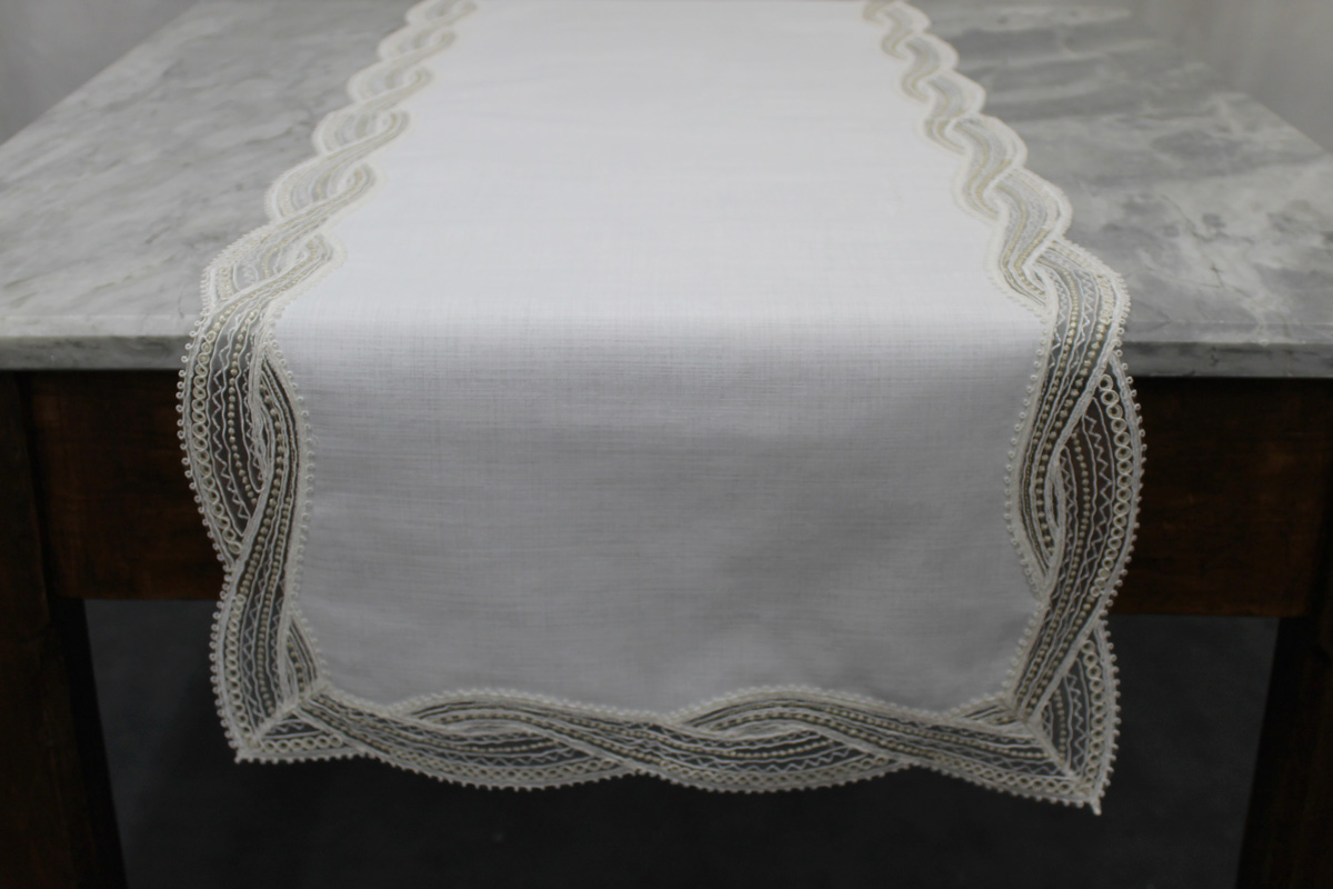 Runner con pizzo macramè rimesso ad intarsio su 4 lati.