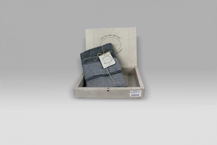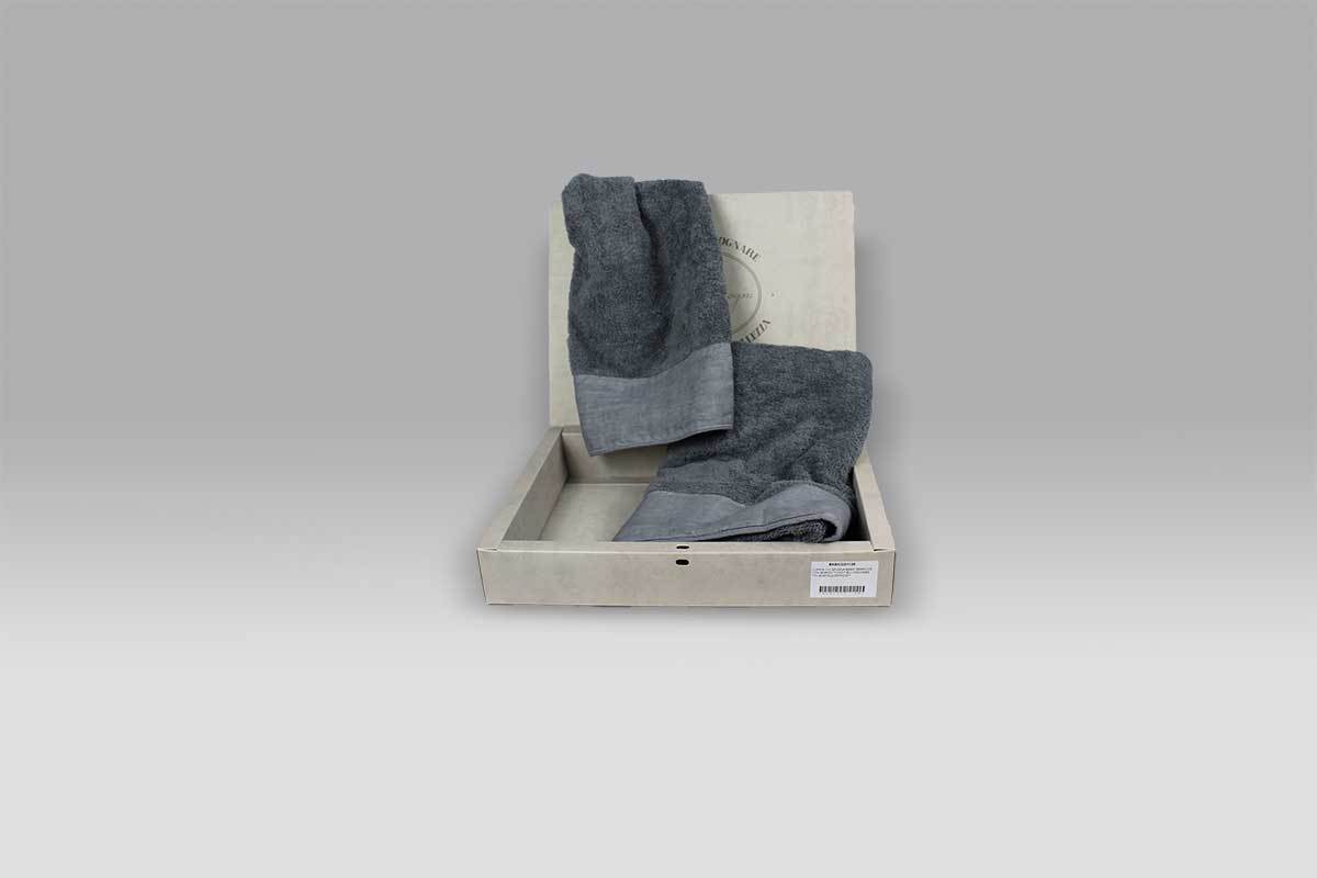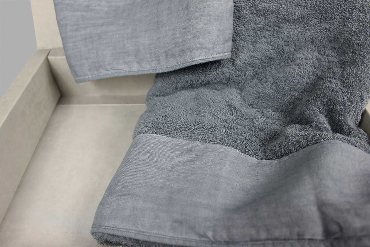 Raffinatissima coppia di asciugamani realizzata con spugna di puro cotone e bordo in lino.