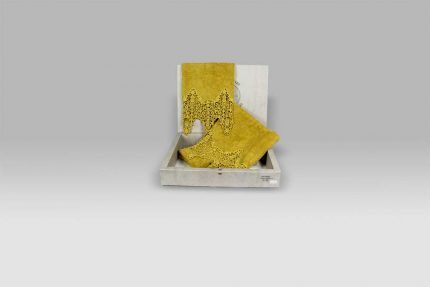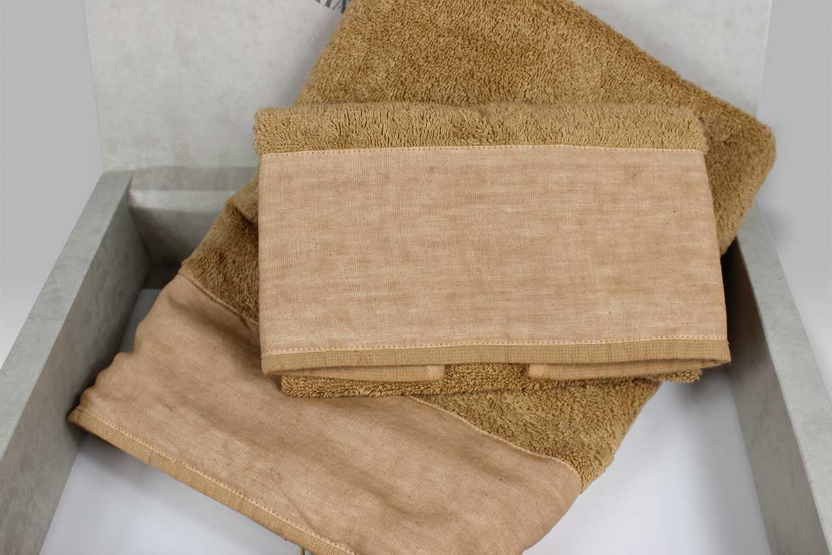 Raffinatissima coppia di asciugamani realizzata con spugna di puro cotone e bordo in lino.