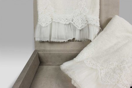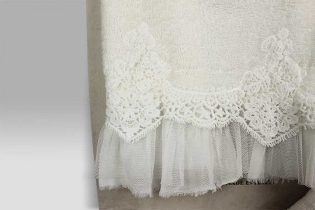 Applicazione di pizzo effetto uncinetto; balza in cotone con sopra balza in tulle.
