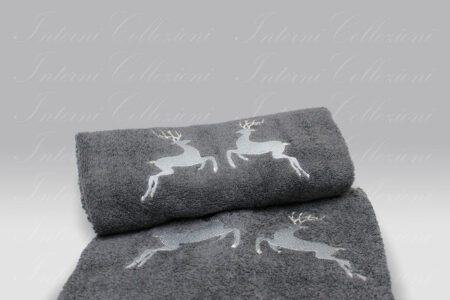 Viene ricamato, sia sul viso che sull’ospite, un cervo metallico lurex nei toni dell’oro e argento.