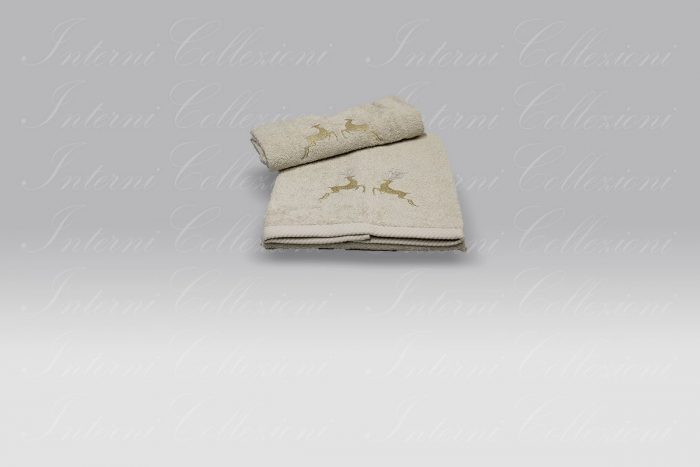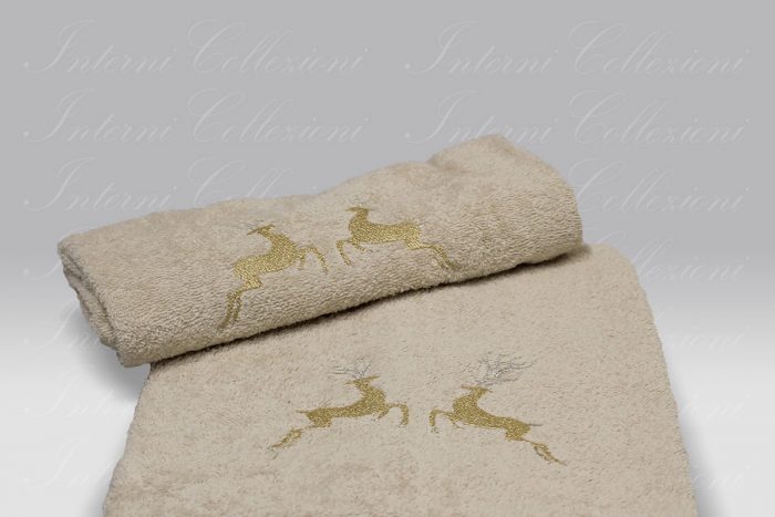 Viene ricamato, sia sul viso che sull’ospite, un cervo metallico lurex nei toni dell’oro e argento.