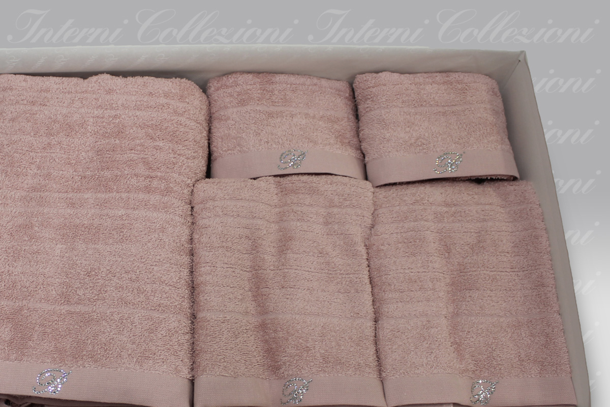 Set 5 pezzi composto da: n.2 viso (cm60x110) + n.2 ospite (cm40x60) + n.1 telo doccia (cm100x150)