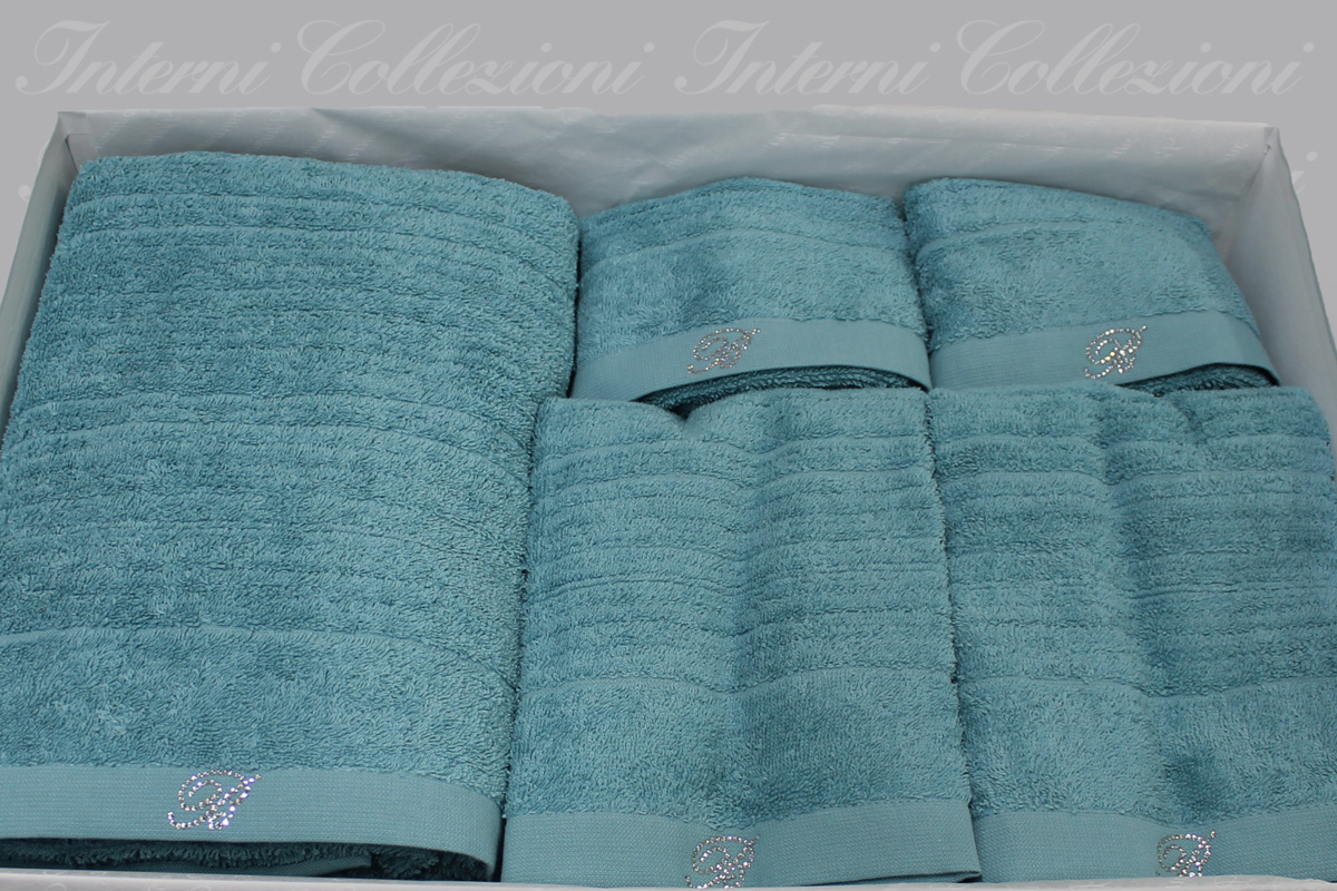Set 5 pezzi composto da: n.2 viso (cm60x110) + n.2 ospite (cm40x60) + n.1 telo doccia (cm100x150)