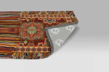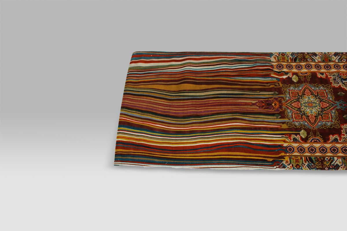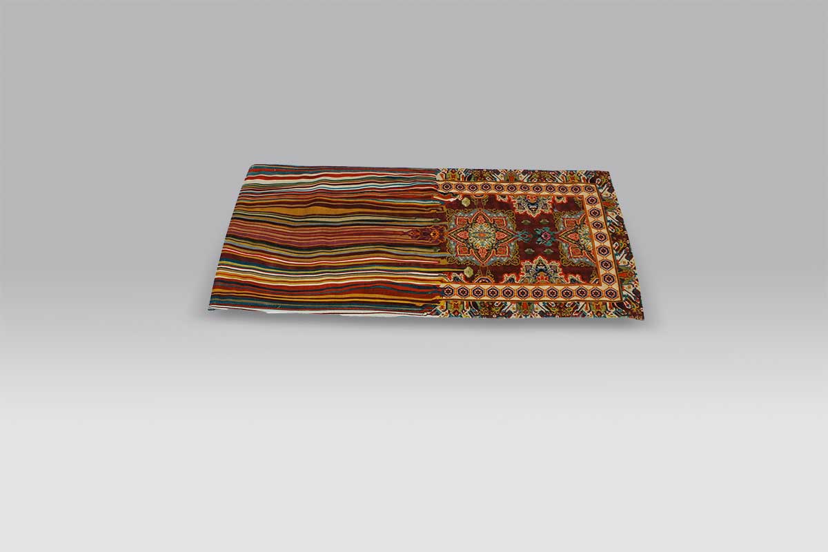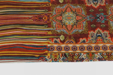 In questo articolo abbiamo un disegno effetto tappeto persiano che va sfumando con righe multicolore.