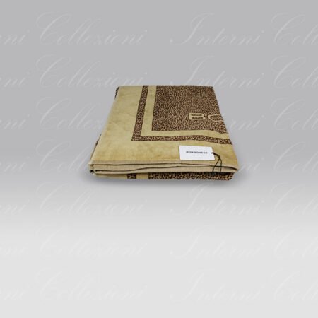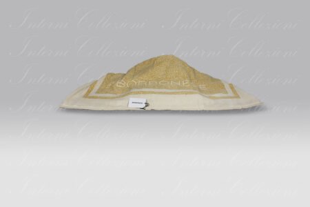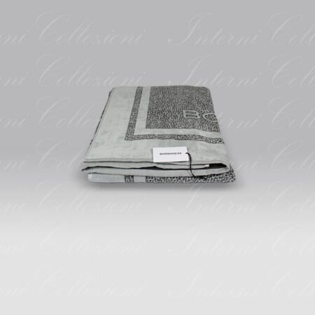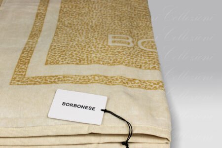 Disegno occhio di pernice allover e rifinito da un doppio bordo tinta unita.