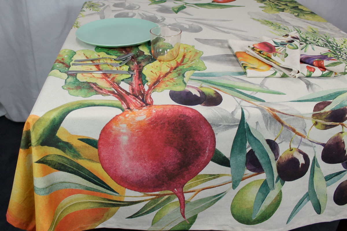 Fantastica tovaglia con tovaglioli della linea Radici che utilizza prevalentemente materiali riciclati.
