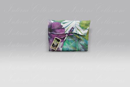 Una fantastica stampa floreale e foglie nei toni del verde e viola.