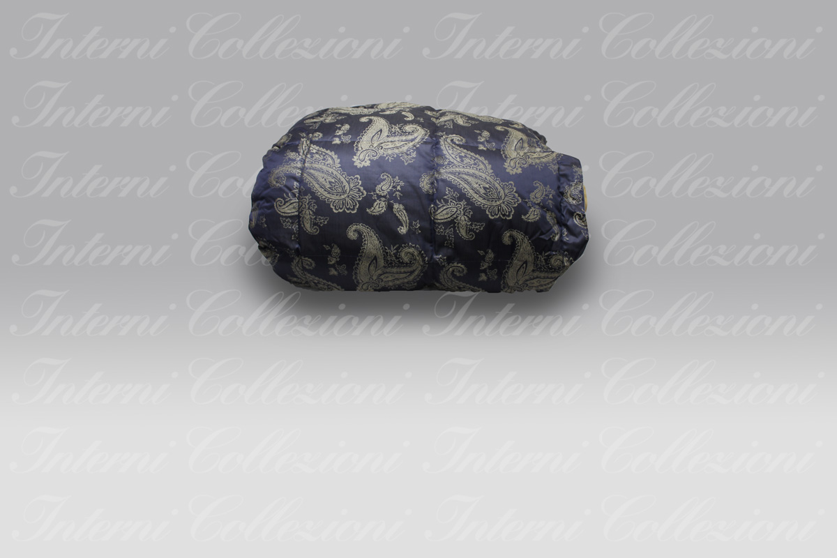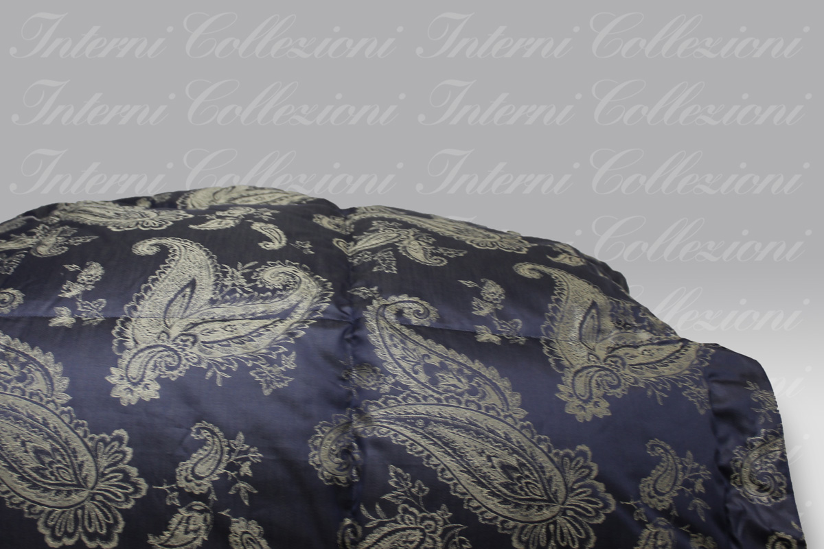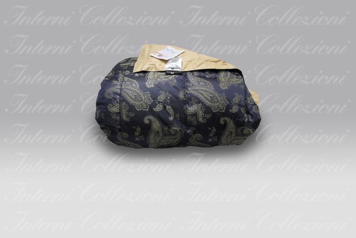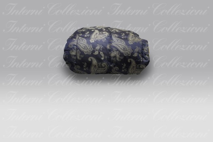 Interamente double face: un lato con tessuto operato con disegno cashmere nei toni del blu e neutro, l’altro lato in tinta unita.