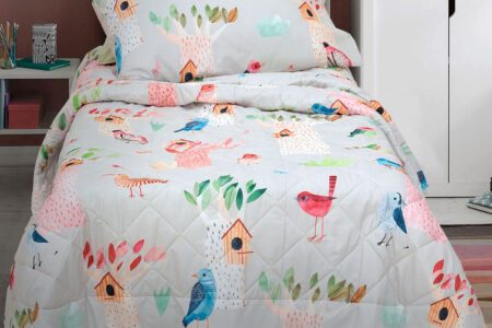 Tessuto in microfibra eole con stampa uccellini e casette dai colori mozzafiato.