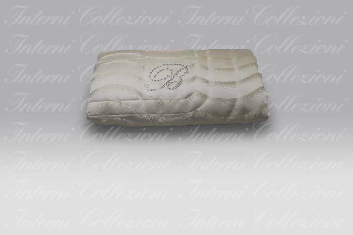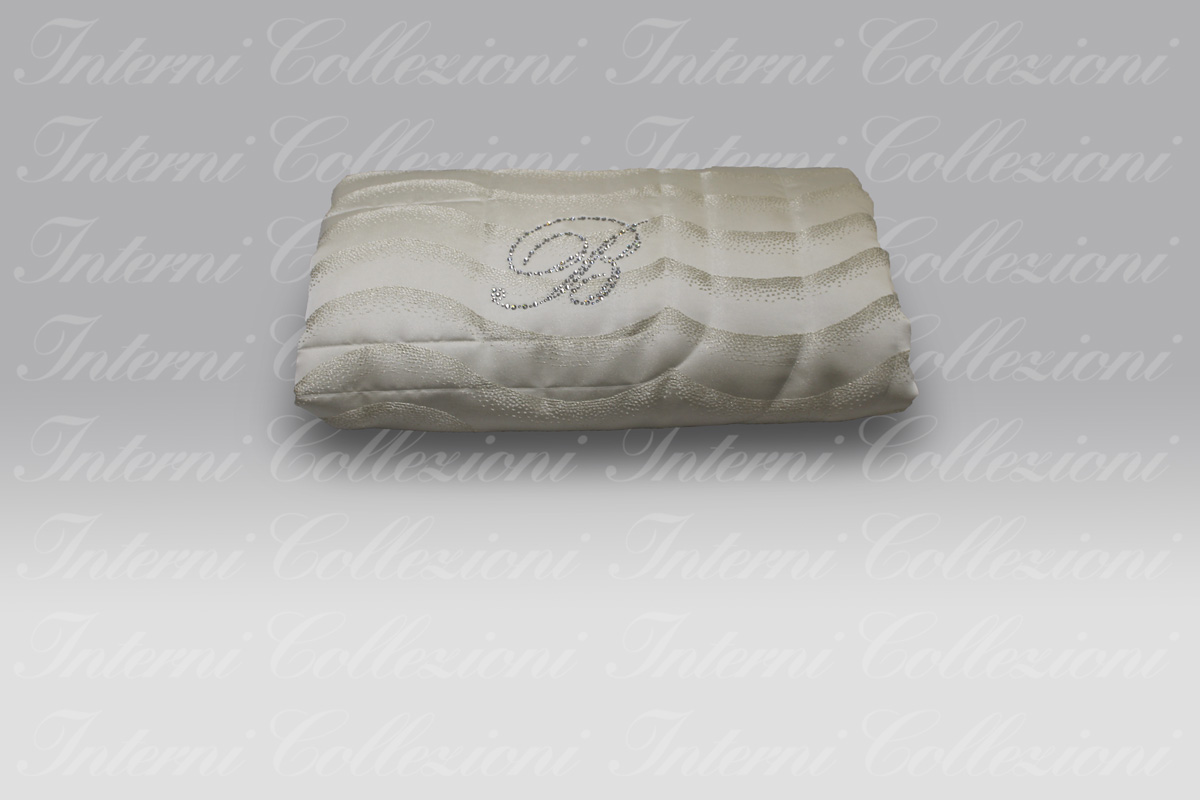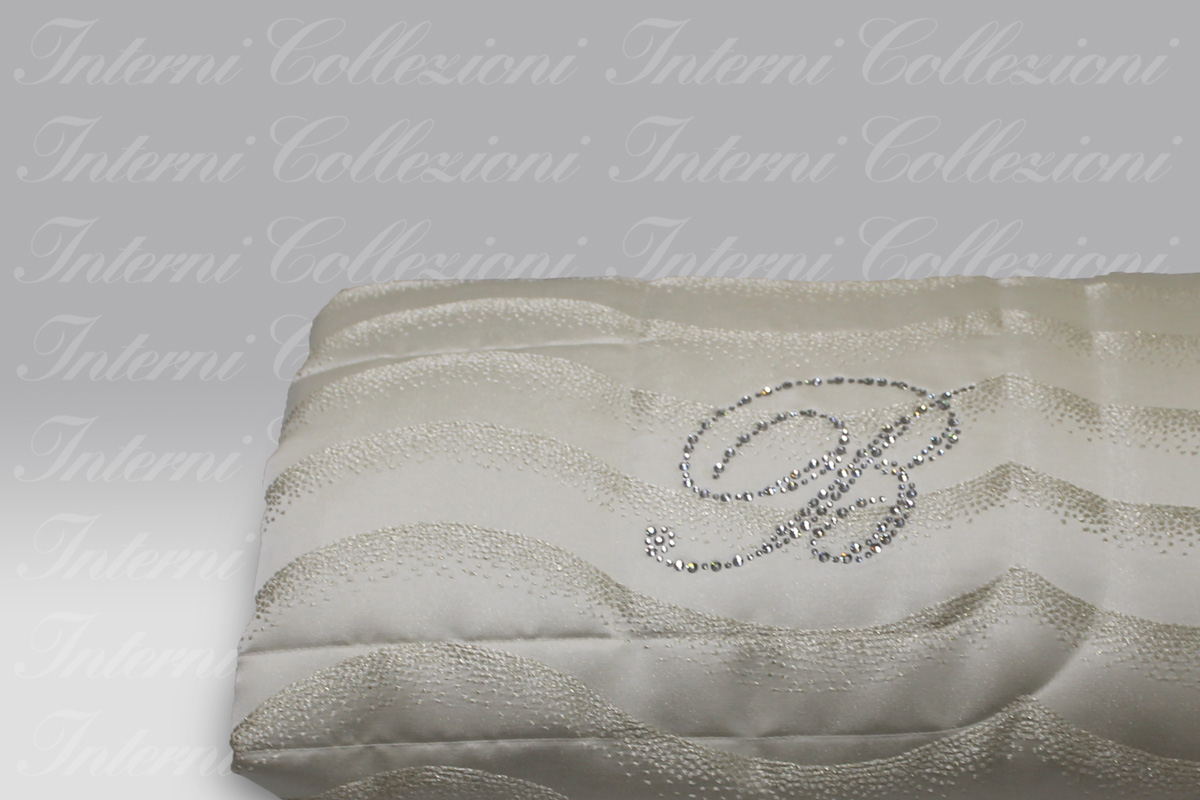 Un tessuto operato con disegno ondine, ai piedi del letto viene applicato il logo in Swarovski.