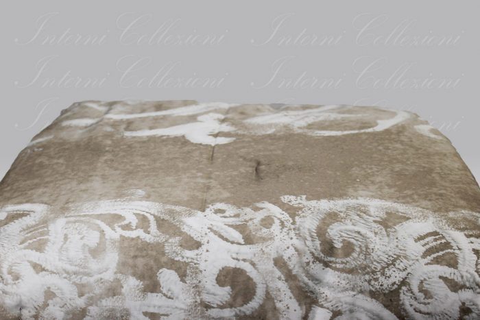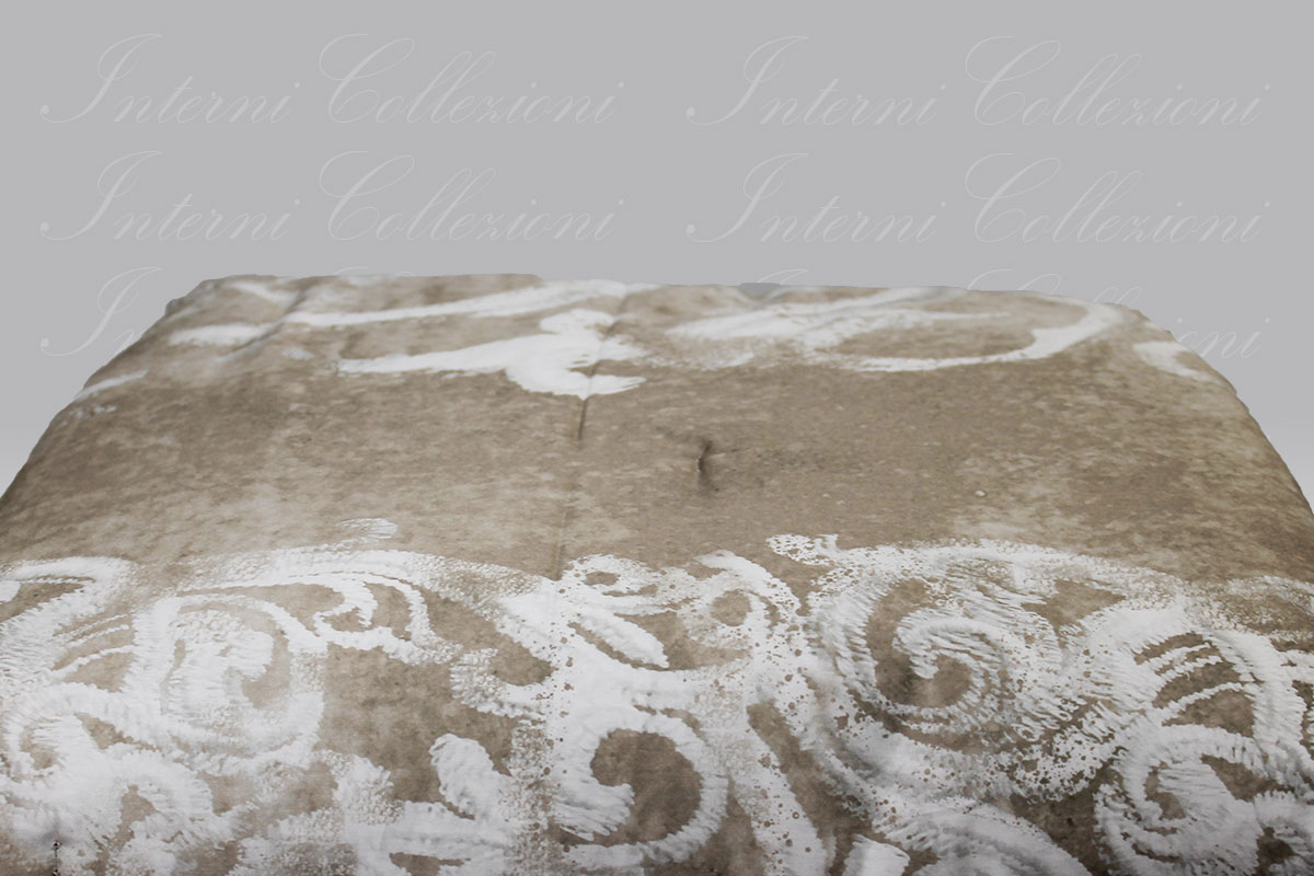Stampa su raso di cotone di elementi decorativi ispirati a macro ricami su fondi marmorizzati.